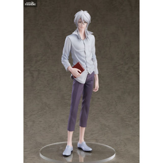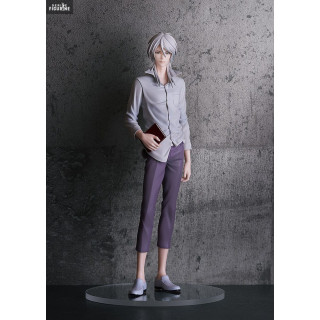 Les détails de cette figurine sont remarquables, avec une attention particulière portée à sa tenue décontractée mais soignée. Makishima porte une chemise blanche légèrement déboutonnée, associée à un pantalon violet et des chaussures grises élégantes. Ses cheveux blancs, coiffés avec soin, encadrent son visage d'une manière qui accentue son regard intense et sa présence imposante.