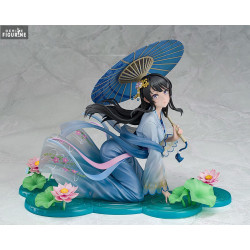 Cette figurine sublime présente Mai dans une version alternative en tenue traditionnelle chinoise, ou hanfu. Accroupie élégamment sur un socle en forme de mare aux lotus, elle tient une ombrelle bleue finement décorée. Sa longue chevelure noire ondule naturellement dans le dos, tandis que son regard doux et légèrement surpris renforce son aura de grâce silencieuse. Sa robe bleutée est ornée de détails floraux roses et dorés, avec des voiles transparents ajoutant une légèreté remarquable à l’ensemble.