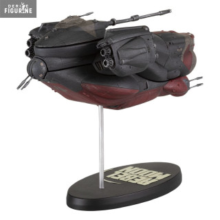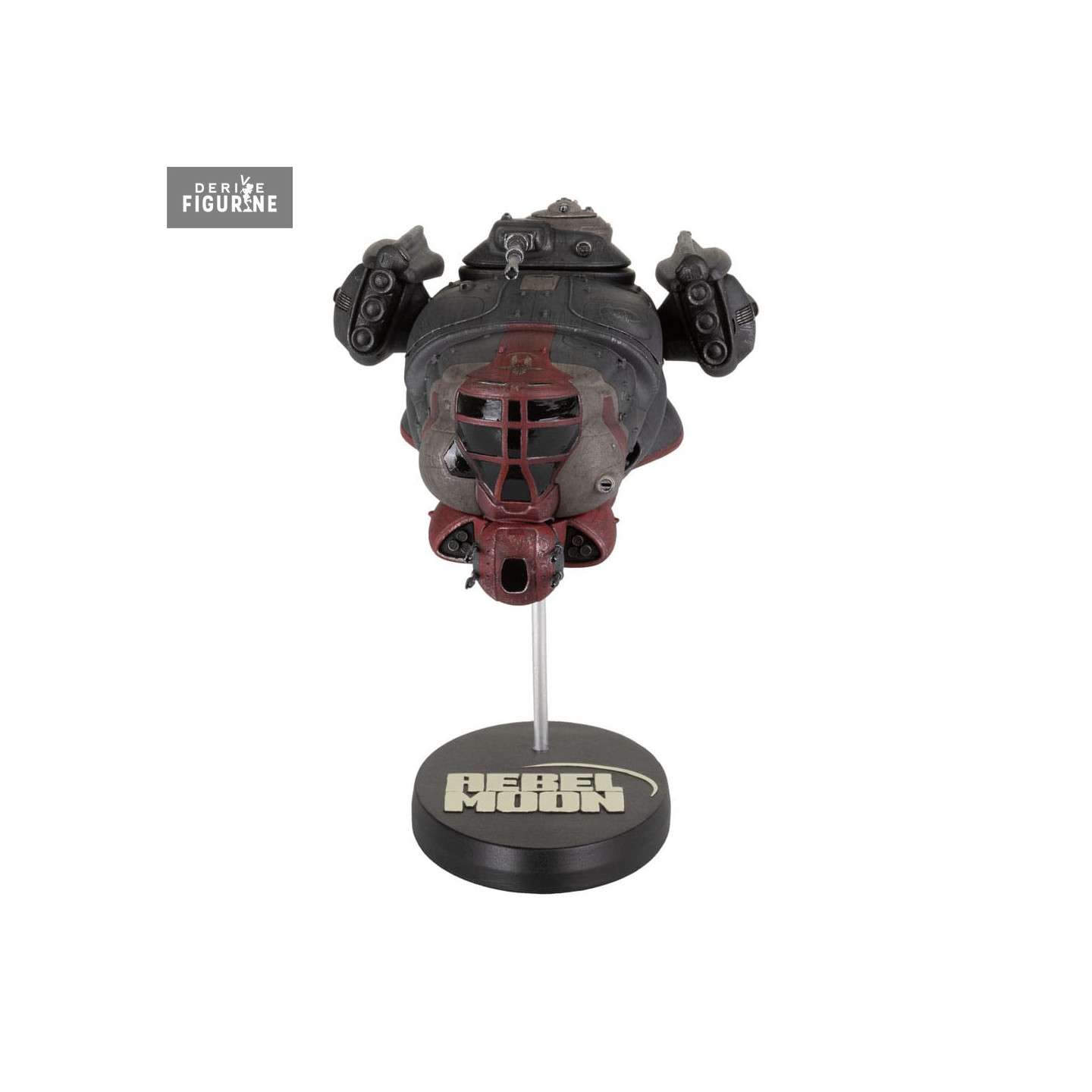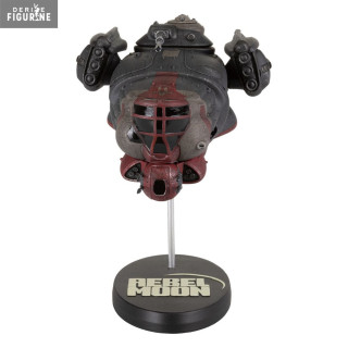 La figurine est magnifiquement peinte à la main, mettant en valeur la qualité exceptionnelle de l'artisanat. Pour accentuer davantage cette pièce, le vaisseau est maintenu en l'air par une tige métallique, reposant sur une base ornée du logo "Rebel Moon", offrant une présentation majestueuse.