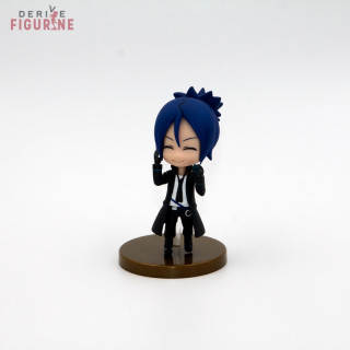 Figurine d'occasion et officielle de Rokudou Mukuro en PVC qui mesure environ 7,5 centimètres de haut. Rokudou est tout sourire avec une boîte Vongola dans la main gauche et deux bagues sur l'autre. Il s'agit d'un objet d'occasion en parfait état. Le fabricant est Takara Tomy A.R.T.S, vendu sans boîte.