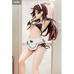 La figurine la représente en train de se changer dans une petite pièce aménagée avec soin. Vêtue d’un bikini noir à détails blancs, complété d’un petit tablier de maid, elle adopte une posture dynamique, les bras levés au-dessus de la tête. Son expression mêle surprise et douceur, renforçant le côté complice de la scène.