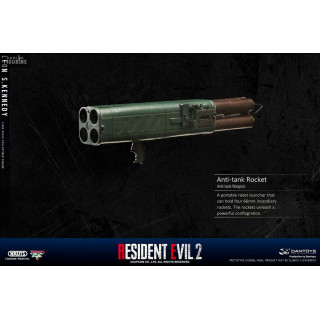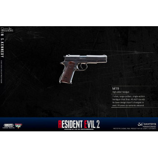 Figurine officielle de Leon S. Kennedy mesurant environ 30 centimètres de haut, à l'échelle 1/6. Le fabricant est Damtoys.