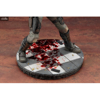 Chris Redfield est un personnage bien connu des fans de la licence Resident Evil. Ici, il est représenté avec de nombreux détails et il en va de même pour son socle qui est décoré de taches de sangs provenant sûrement d'un zombie, ainsi que de douilles et de chargeurs.