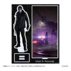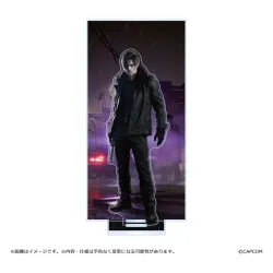 Visuellement, Leon apparaît de face, légèrement de biais, avec une expression sérieuse et des cheveux bruns coiffés sur le côté. Il porte une tenue sombre complète, gants compris, et tient une arme de poing vers le bas, dans une main, avec une présence très “terrain”. La pièce se présente comme un display sur socle, avec un grand visuel vertical en arrière-plan (ambiance nocturne sous la pluie, éclairages violets et rouges) et la silhouette de Leon mise en avant, détourée par un liseré clair, pour accentuer la profondeur une fois exposée.