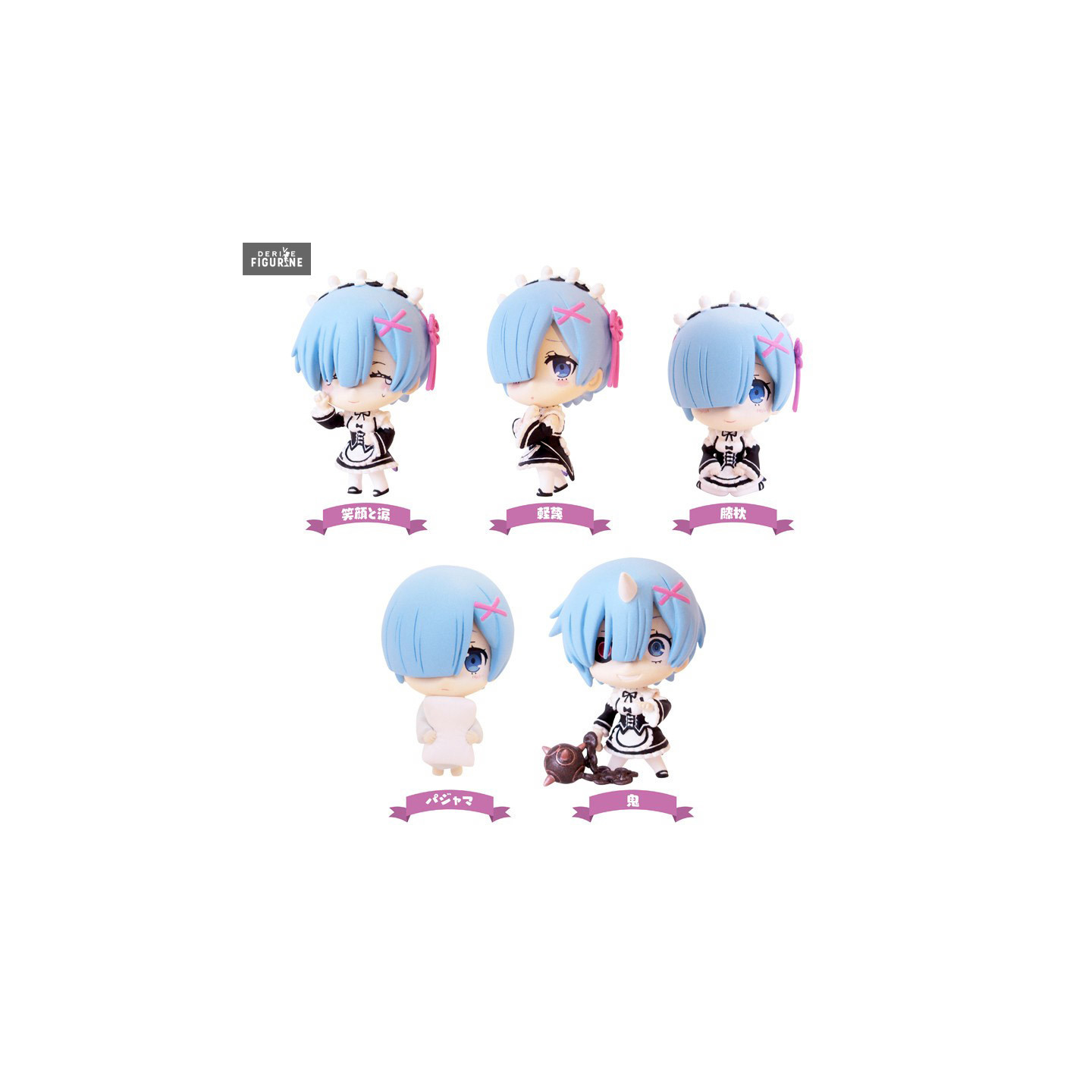 La collection Ippai vous permet d'obtenir au hasard l'une des mignonnes petites Rem de Re:Zero visible sur la photo. Vous avez une chance d'avoir la Rem en pyjama, celle qui rougit, la démoniaque, celle à genoux ou encore la petite Rem en train de sourire et pleurer. Il existe cinq modèles différents.