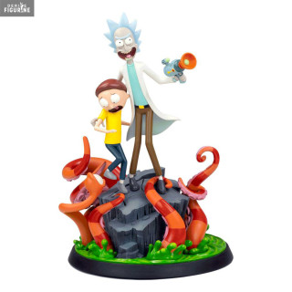 Les folles aventures du scientifique aux expériences toutes plus déjantées les unes que les autres accompagnés de son petit fils adoré, sont mises à l'honneur grâce à cette magnifique statuette en édition limitée à 1000 exemplaires numérotés et peints à la main. La pièce signée Mondo nous présente un Rick excité, ce qui ne semble pas être le cas de notre cher Morty plutôt terrifié par la créature émanant du socle haut en couleur de celle-ci ! A noter que la main gauche de Rick tenant un pistolet peut être changée pour lui permettre de retrouver sa petite flasque adorée !