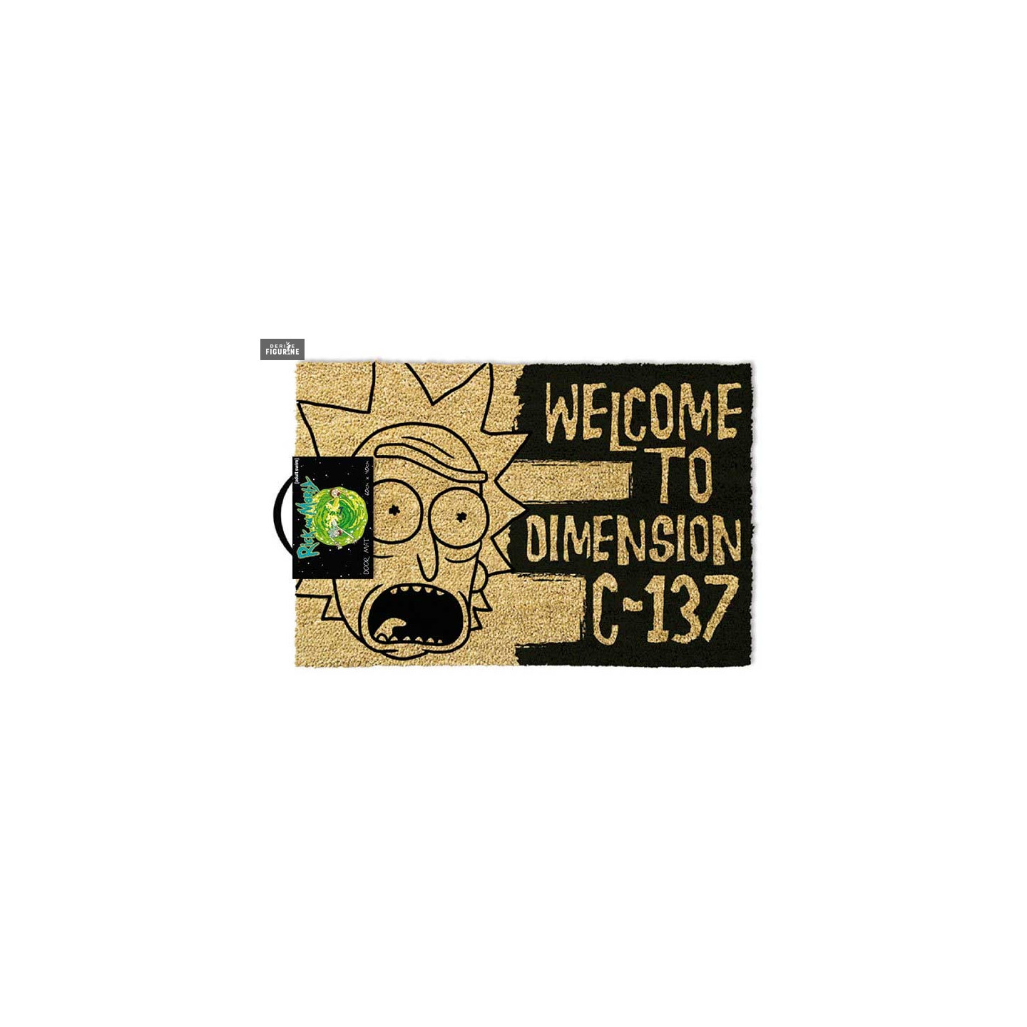 Sur ce paillasson, vous pouvez voir Rick Sanchez qui fait une drôle de tête et à côté de lui, on peut voir inscrit en anglais : "bienvenue dans la dimension C-137". Un petit clin d’œil qui fera sûrement sourire tous les fans de Rick et Morty qui passeront le pas de votre porte.