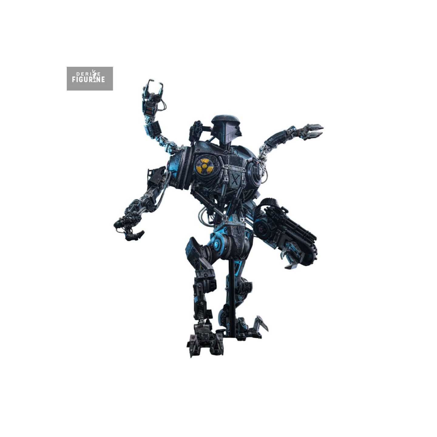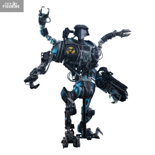 La figurine reproduit fidèlement la carcasse de Cain, avec son corps entièrement mécanisé, ses bras articulés massifs et son torse orné du logo nucléaire jaune. Chaque partie semble surgie du film : vérins, câbles apparents, rotules détaillées, canons intégrés et éléments mobiles. La tête est interchangeable, avec une version dotée d’un écran rétroéclairé affichant le visage vidéo de Cain.