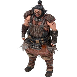 Visuellement, on le voit debout, massif, avec les bras nus et une musculature bien marquée. Il porte une armure brun/bronze faite de plaques superposées, avec de grandes épaulières et des protections épaisses aux avant-bras, plus une ceinture large chargée de détails. Le bas de l’armure forme une sorte de jupe de combat en couches, avec des pans irréguliers et des lanières, et les jambes sont couvertes de bandes et protections dans des tons sombres jusqu’aux bottes. Son visage affiche une expression de colère, avec une barbe et une moustache noires, et ses cheveux sont attachés en chignon haut, ce qui renforce la silhouette de “colosse” en armure.