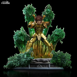 Vêtu de son armure d’or détaillée, Dohko prend appui sur une base inspirée de la colonne du Temple de la Balance. Derrière lui, les formes spectaculaires de huit dragons verts surgissent en spirale, symbolisant la technique du Rozan Shō Ryū Ha, l’un de ses assauts les plus emblématiques. Son regard déterminé et ses poings serrés traduisent toute la concentration du Chevalier d’Or prêt à libérer son cosmos.