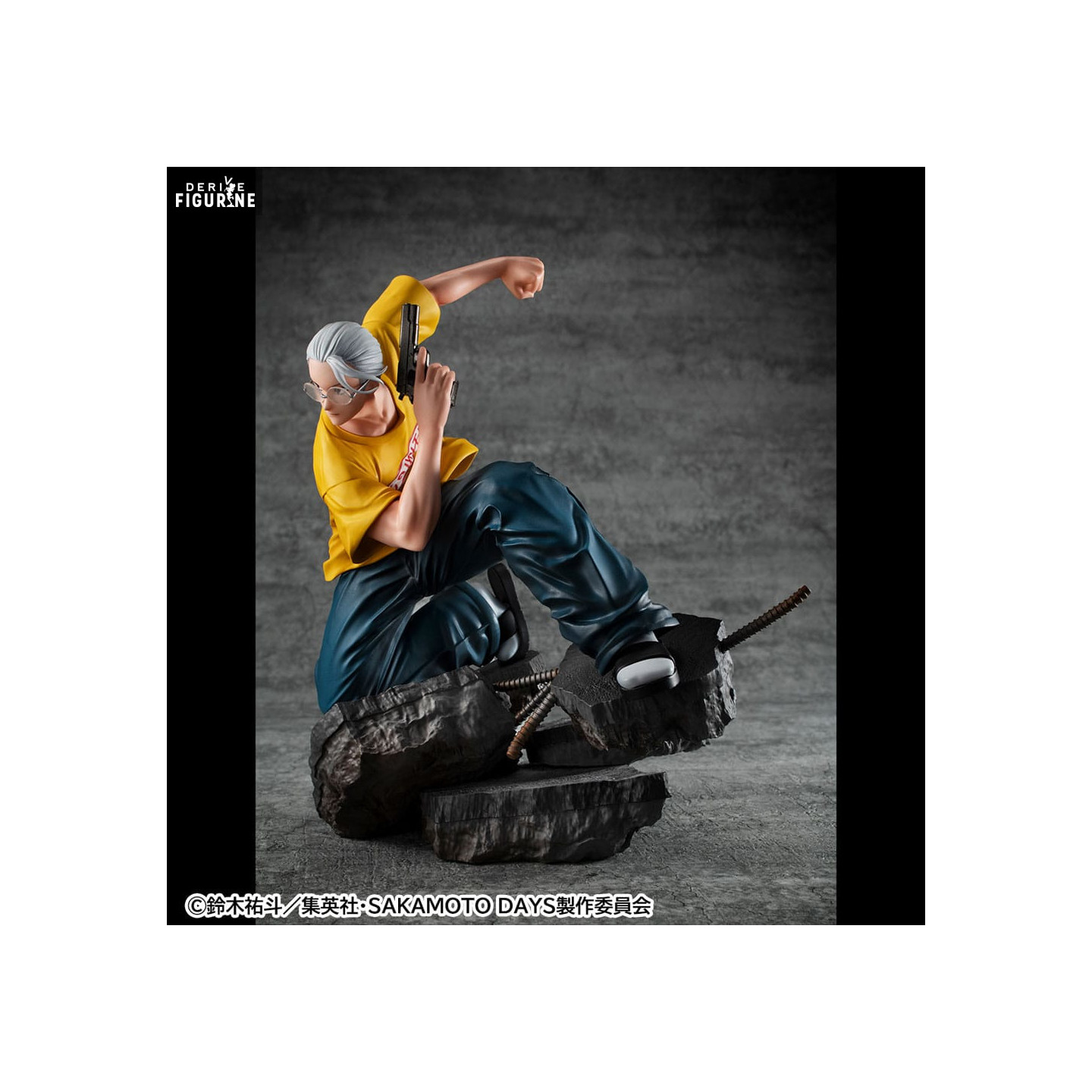Cette figurine de Taro Sakamoto, réalisée par Megahouse, capture parfaitement l’essence du personnage en pleine action. Mesurant 20 cm de haut, elle le représente dans une pose dynamique, prêt à dégainer son arme avec un regard perçant derrière ses lunettes iconiques. Le décor détaillé, avec des blocs de béton et des barres métalliques tordues, renforce l’impression d’un combat en cours. Le soin apporté aux textures, des plis de son t-shirt jaune à l’éclat réaliste de son arme, en fait une pièce de collection idéale pour les fans de Sakamoto Days.