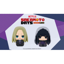 Sur les figurines, les deux personnages conservent leurs traits emblématiques dans un style chibi assis. Shishiba, à gauche, porte ses longs cheveux blonds tombant de chaque côté de son visage, une expression lasse typique, et un costume sombre avec une chemise violette qui ressort nettement. Osaragi, à droite, apparaît avec ses cheveux noirs épais encadrés par un large capuchon gris. Son regard mi-clos et ses joues rosées renforcent son allure calme et détachée. Les deux modèles adoptent des formes arrondies et un rendu mat fidèle à cette collection.