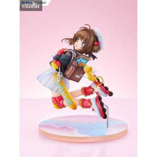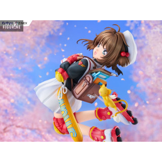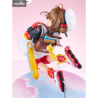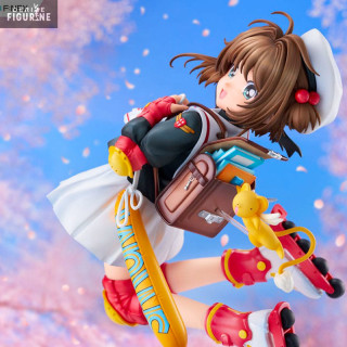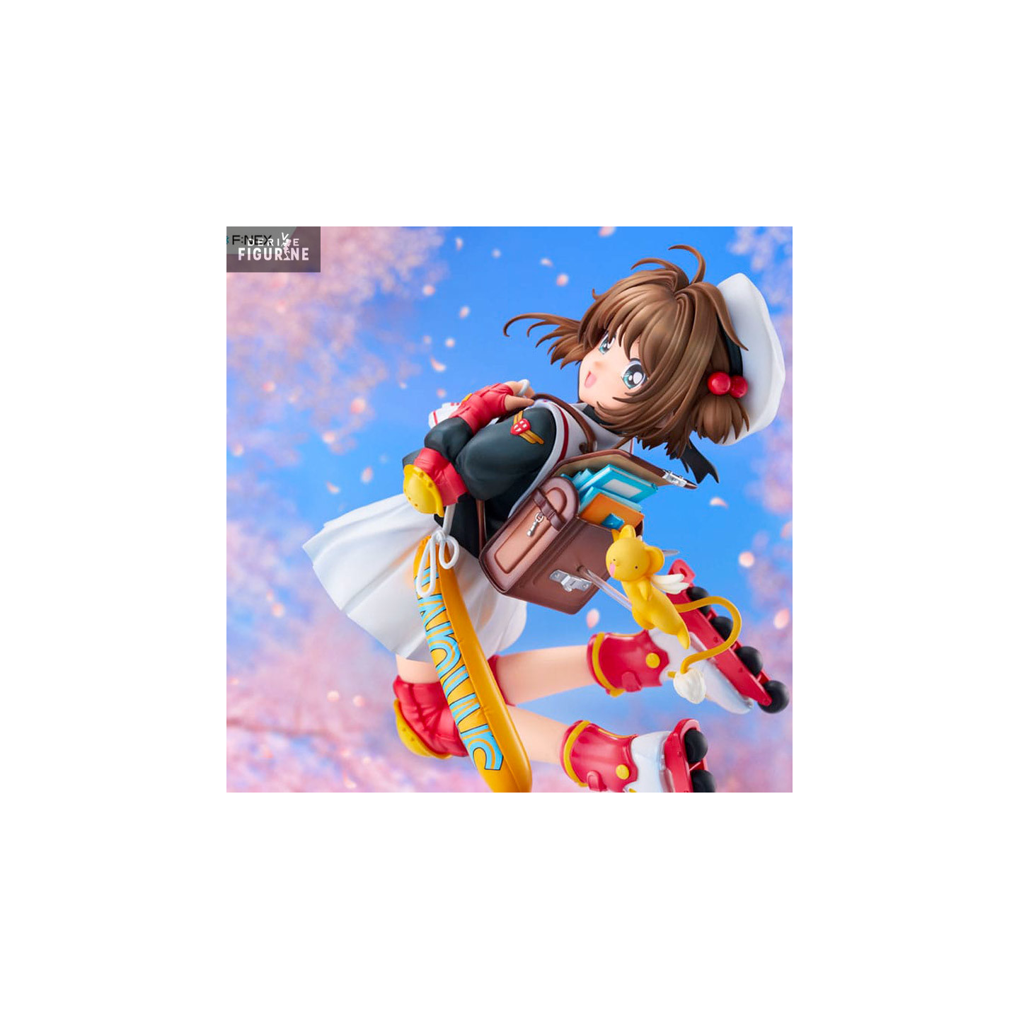 Les rollers aux pieds de Sakura ajoutent une dimension ludique à la scène, évoquant l'esprit libre et aventureux de la jeune chasseuse de cartes. Keroboro, accroché à son sac, apporte une touche de mignonnerie à l'ensemble, rappelant la complicité entre Sakura et ses compagnons magiques.
