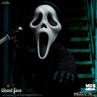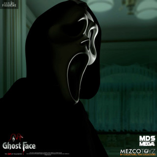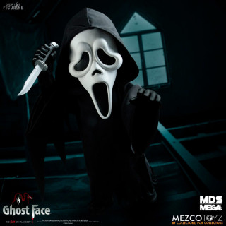 Figurine officielle de Ghost Face mesurant environ 38 centimètres de haut. Elle est issue de la collection Mezco Designer Series (MDS). Le fabricant est Mezco Toys.