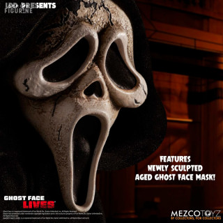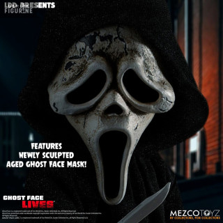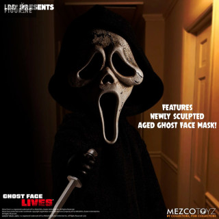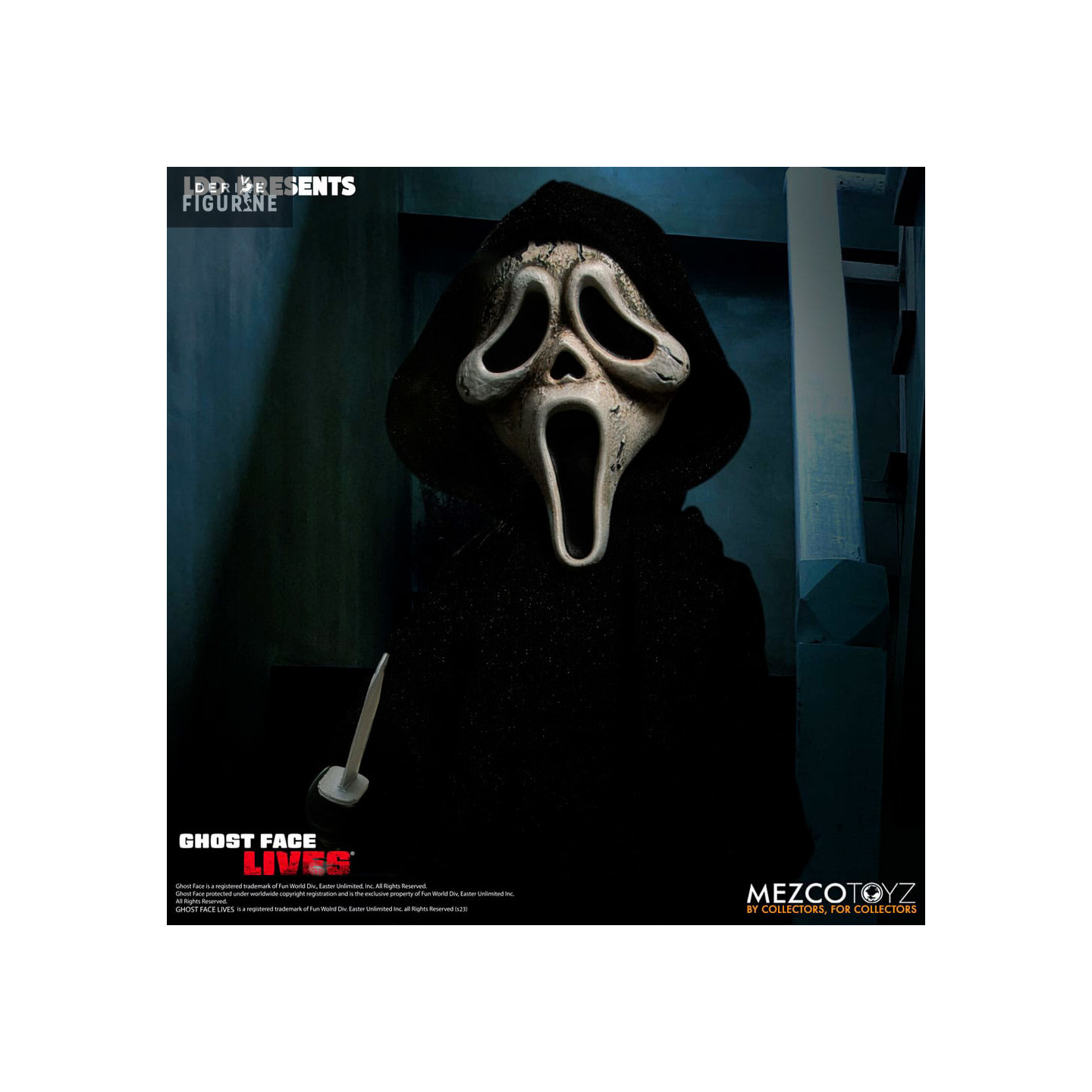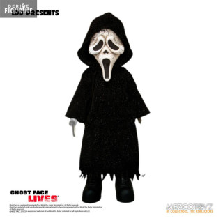 Poupée officielle de Ghostface avec vêtements en tissu mesurant environ 25 centimètres de haut. Elle est issue de la collection Living Dead Dolls. Le fabricant est Mezco Toys.