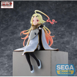La figurine la représente assise au bord d’un rebord, en pleine gestuelle douce et ouverte. Elle porte une tenue blanche à cape longue, rehaussée d’un col d’armure et de détails dorés. Sa chevelure blond pâle aux pointes teintées de rose est sculptée en de longues mèches dynamiques, dont l’une s’enroule en volute autour de sa tête. Une mèche effilée évoque une sorte de flamme stylisée qui prolonge le mouvement, ajoutant un effet visuel fort et unique.