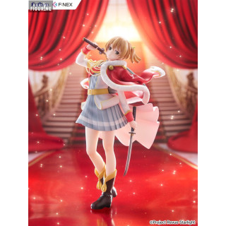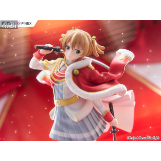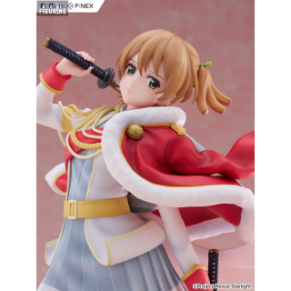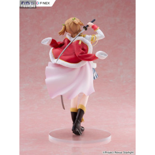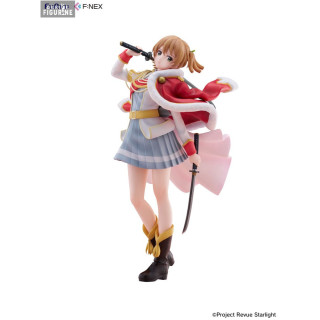 Cette superbe figurine à l’échelle 1/7, mesurant environ 23 centimètres de haut, capture avec une grande fidélité son apparence sur scène. Revêtue de son uniforme rouge et blanc de Revue, elle se tient dans une posture à la fois gracieuse et imposante, une main sur le pommeau de son sabre, l’autre tenant sa cape virevoltante. Sa jupe plissée, ses bottes de scène et l’élégance de ses mouvements retranscrivent l’esprit du théâtre et de la compétition dramatique qui caractérisent la série.