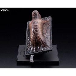 Cette statuette le représente dans toute son étrangeté : deux corps fusionnés dans un cadre métallique, à la peau visqueuse et aux teintes sombres, entre le bronze et le noirâtre. L’un est rampant, l’autre écrasé, créant une silhouette oblique troublante. Les textures sont rugueuses, presque écœurantes, avec des détails sculptés qui soulignent l'aspect charnel et oppressant de la créature.