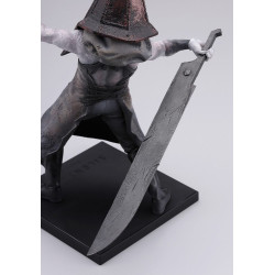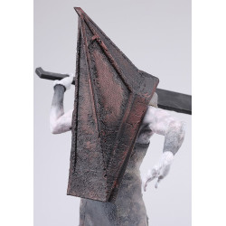 Sur cette figurine, Red Pyramid Thing porte son lourd tablier gris texturé qui tombe jusqu’aux chevilles, comme un mélange de tenue d’exécution et de blouse de boucher usée par le temps. Ses bras nus, d’un blanc maladif, sortent du tissu, muscles tendus, veines visibles. Le casque pyramidale est large, anguleux, couvert de reliefs et de traces sombres brun-rouille. Dans ses mains, il tient une longue arme droite, façon lance ou grande lame, qui s’étire derrière lui et accentue la dynamique de la pose. Ses bottes sombres sont solidement ancrées sur une base rectangulaire noire, simple mais idéale pour le faire trôner au centre d’une collection Silent Hill ou d’un rayon horreur.