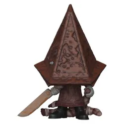 Visuellement, la figurine montre Pyramid Head avec son immense casque pyramidal rouillé, brun et texturé, avec une vis apparente sur le côté et une plaque triangulaire en relief sur l’avant. Il porte une tenue sombre brun-rouge type tablier, et des gants gris aux mains. Dans sa main gauche, il tient une grande lame couleur métal, marquée par des traces brun-orangé, tandis que l’autre main serre un petit objet cylindrique. À ses pieds, on voit un corps allongé et ligoté, partiellement visible derrière ses bottes noires, ce qui donne un décor intégré à la scène.