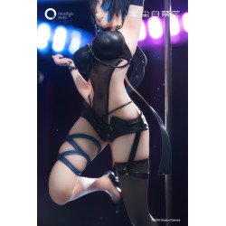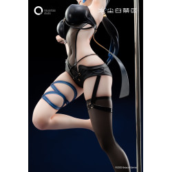 On la voit accrochée à une barre verticale sur une base ronde sombre, un bras levé au-dessus de la tête et l’autre main ouverte sur le côté. Elle porte une tenue noire très découpée, structurée par des sangles et des liens, avec un long gant et des attaches qui remontent le long de la cuisse. Une jambe est tendue et l’autre repliée, et elle porte des talons fins assortis. Ses cheveux courts bleu nuit encadrent le visage, et quelques rubans/bracelets sombres prolongent la ligne de la pose ; la base large rend l’ensemble simple à exposer malgré la posture “en l’air”.