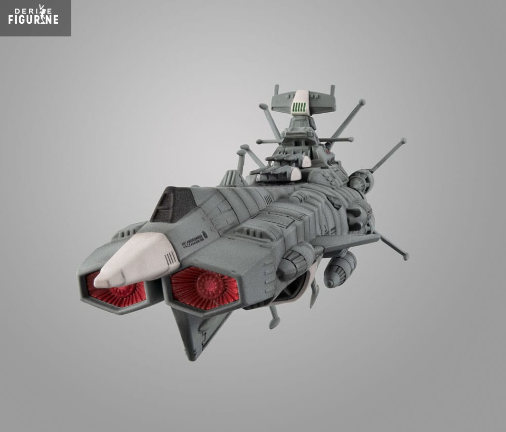 Ce vaisseau en vinyle mesure environ 19 centimètres de long. Il reproduit avec une grande fidélité les lignes puissantes et les détails techniques du U.N.C.F. AAA-1 Andromeda, fleuron de la flotte terrestre dans la guerre contre Gatlantis. On retrouve ses deux canons principaux imposants, sa coque profilée pensée pour les batailles spatiales, et même les propulseurs à l’arrière parfaitement sculptés.