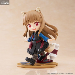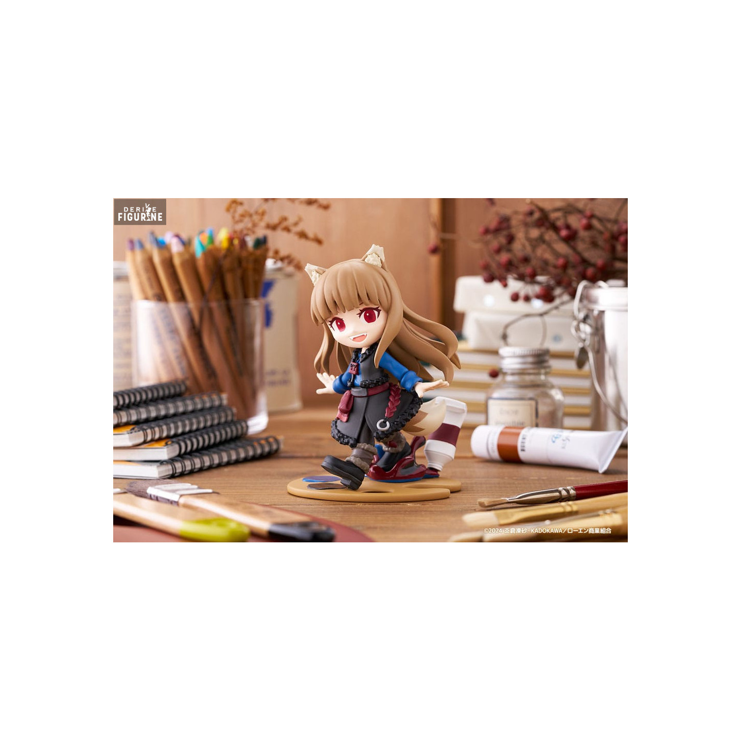 La figurine présente Holo vêtue de sa tenue traditionnelle, comprenant une robe bleue et des accessoires détaillés comme sa ceinture tressée et ses bottes élégantes. Les textures de ses vêtements et les ornements sont minutieusement sculptés et peints, offrant un rendu réaliste et visuellement attrayant. Ses cheveux longs et fluides, sculptés avec précision, ajoutent du mouvement et de la vie à la figurine.