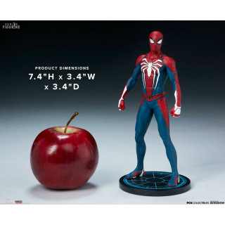 Figurine officielle de Spider-Man en résine mesurant environ 19 centimètres de haut, à l'échelle 1/10. Le fabricant est Pop Culture Shock.
