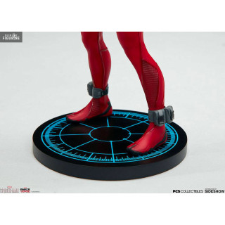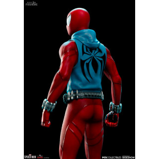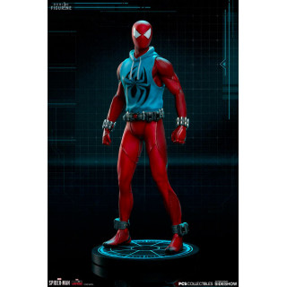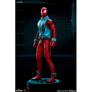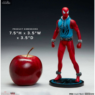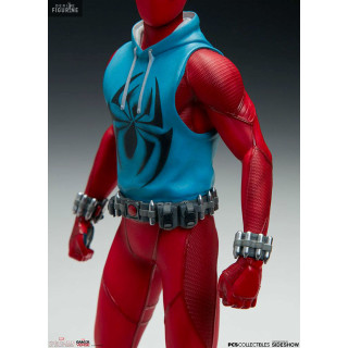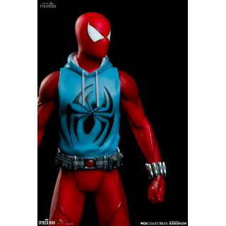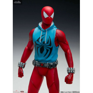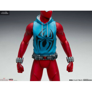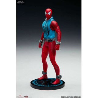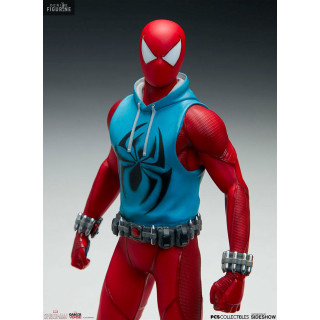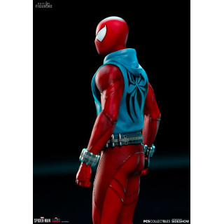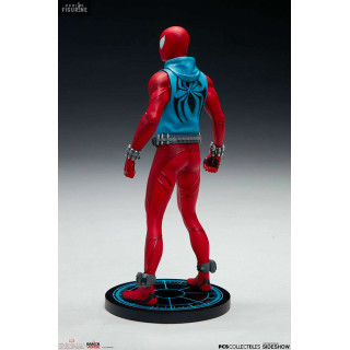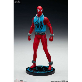 Figurine officielle de Scarlet Spider en résine mesurant environ 19 centimètres de haut, à l'échelle 1/10. Le fabricant est Pop Culture Shock.