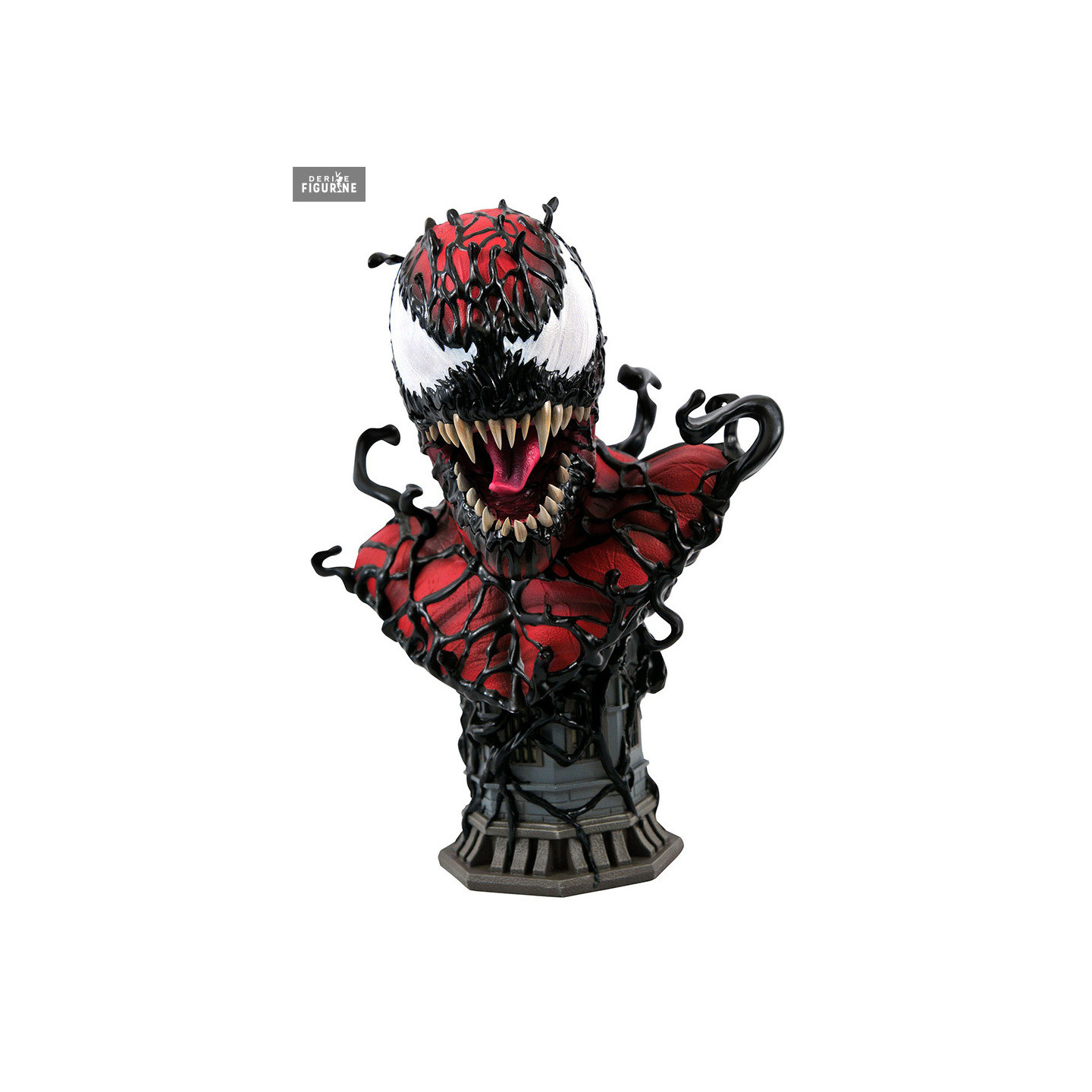 Buste officiel de Carnage en résine mesurant environ 25 centimètres de haut, à l'échelle 1/2. Il est issu de la collection Legends in 3D. Le fabricant est Diamond Select Toys.