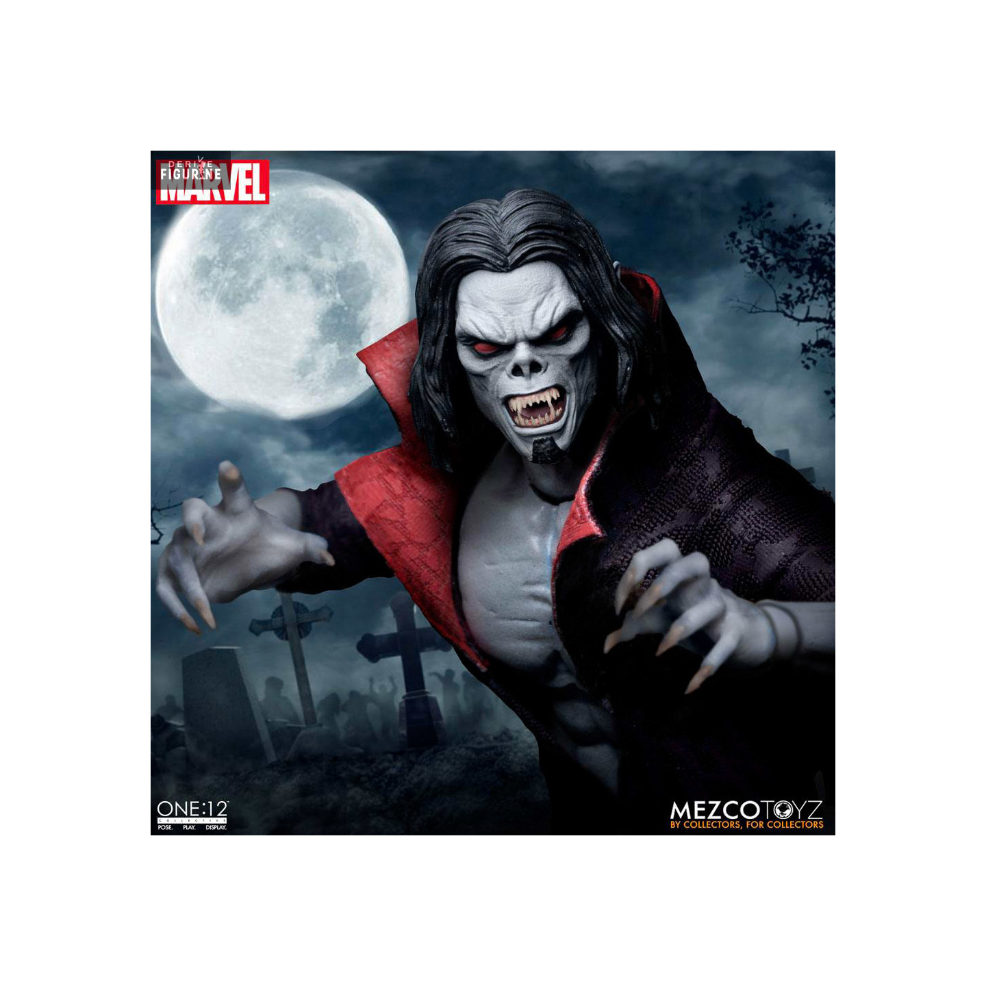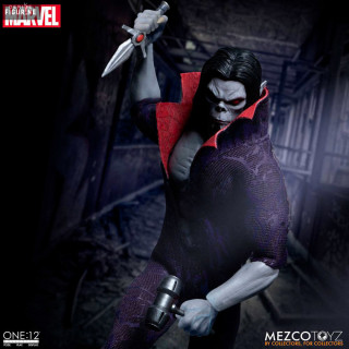 Figurine officielle de Morbius mesurant environ 17 centimètres de haut, à l'échelle 1/12. Elle est issue de la collection One:12. Le fabricant est Mezco Toys.