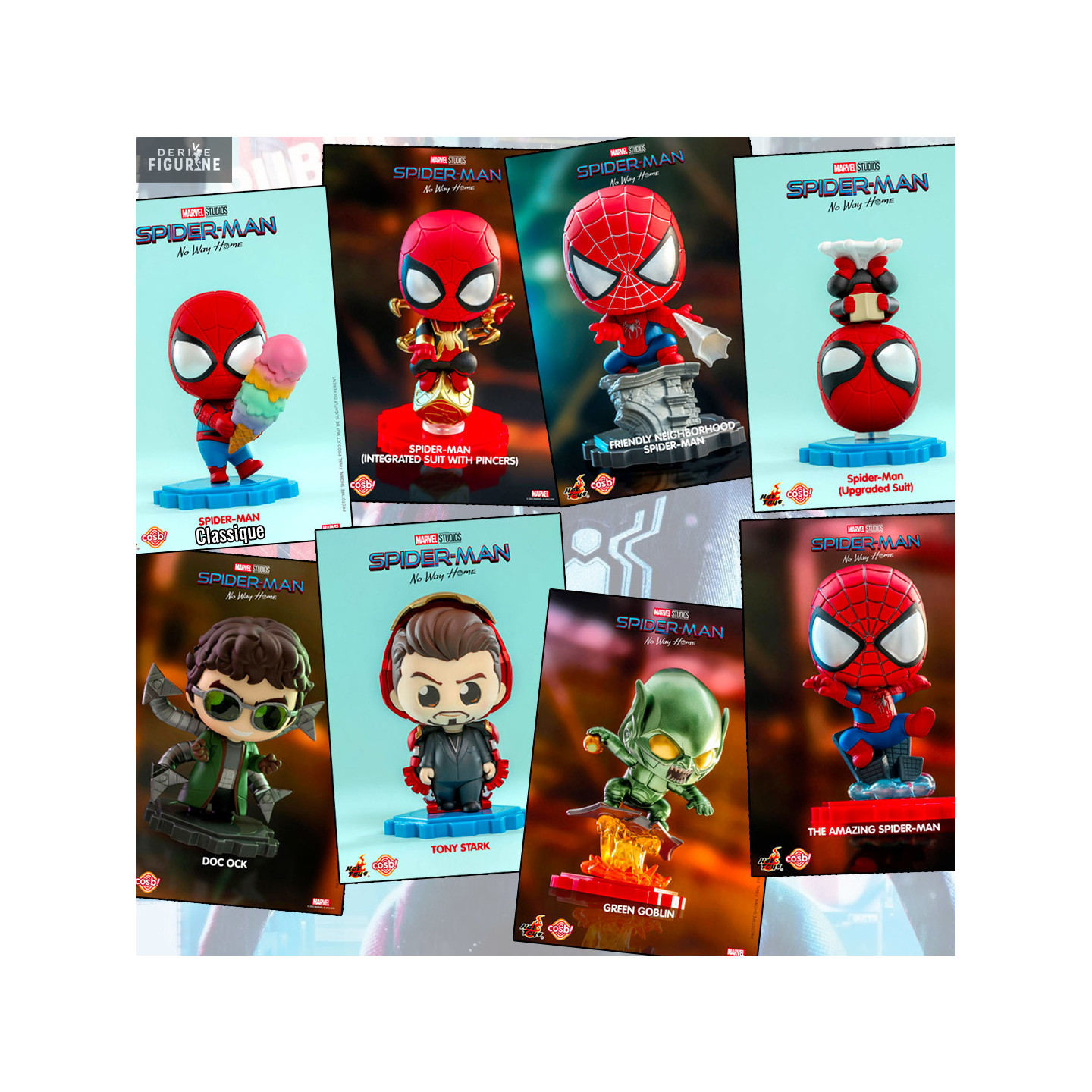 Figurine officielle au choix entre cinq versions de Spider-Man (Classique, Friendly Neighborhood, Integrated Suit, Upgraded Suit ou The Amazing Spider-Man) Doc Ock, Green Goblin ou Tony Stark en PVC mesurant environ 8 centimètres de haut. Elle est issue de la collection Cosbi. Le fabricant est Hot Toys.