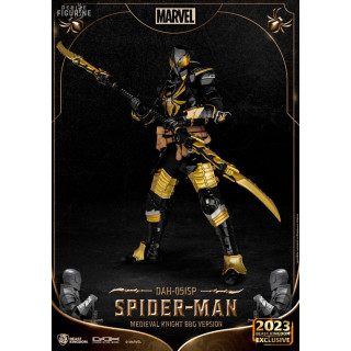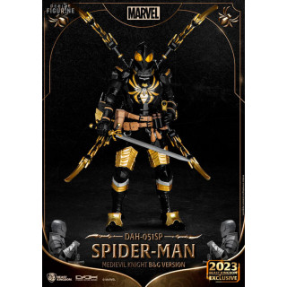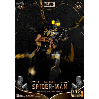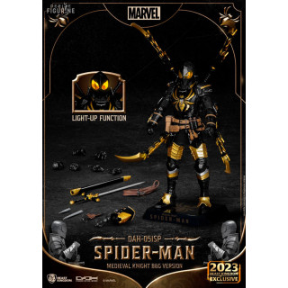 Figurine officielle de Spider-Man, Medieval Knight B&G mesurant environ 20 centimètres de haut, à l'échelle 1/9. Elle est issue de la collection Dynamic 8ction Heroes. Le fabricant est Beast Kingdom. Eclairage LEDs avec 4 Piles LR41 non fournies.
