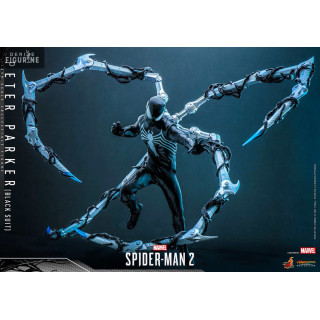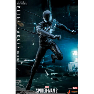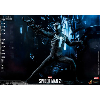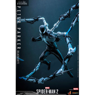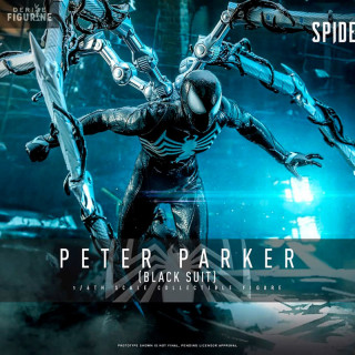 Figurine officielle de Peter Parker Black Suit mesurant environ 30 centimètres de haut, à l'échelle 1/6. Le fabricant est Hot Toys.