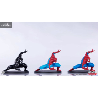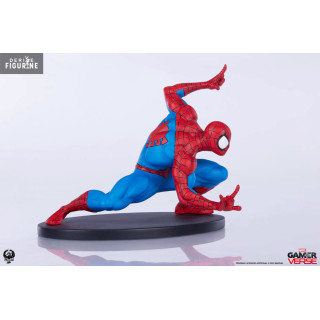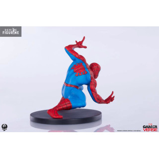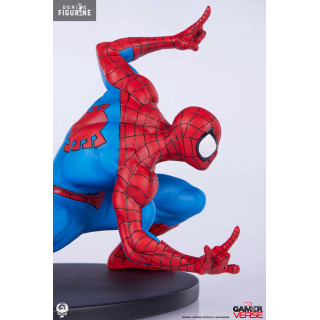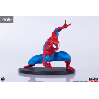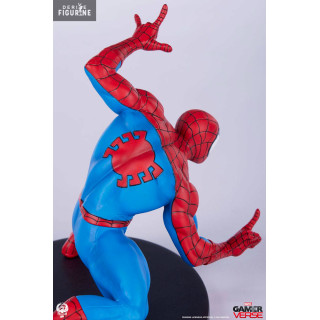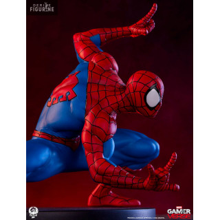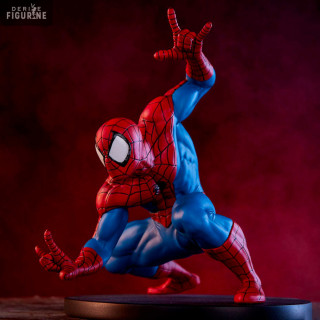 Figurine officielle de Spider-Man en PVC mesurant environ 13 x 18 x 14 centimètres, à l'échelle 1/10. Le fabricant est Premium Collectibles Studio.