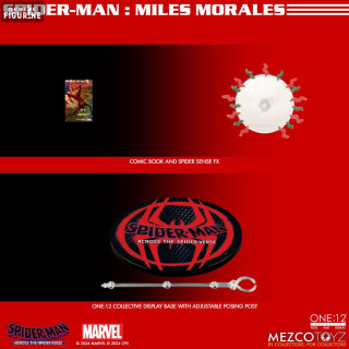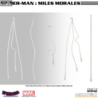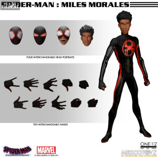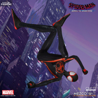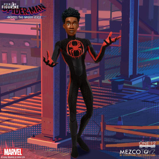 Figurine officielle de Miles Morales en PVC mesurant environ 17 centimètres de haut, à l'échelle 1/12. Elle est issue de la collection One:12. Le fabricant est Mezco Toys.