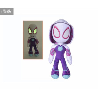 Peluche officielle de Ghost Spider mesurant environ 25 centimètres de haut. Elle est issue de la collection Glow In The Dark Eyes. Le fabricant est Simba.