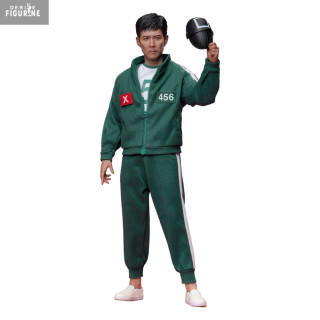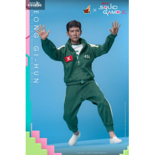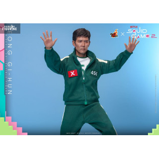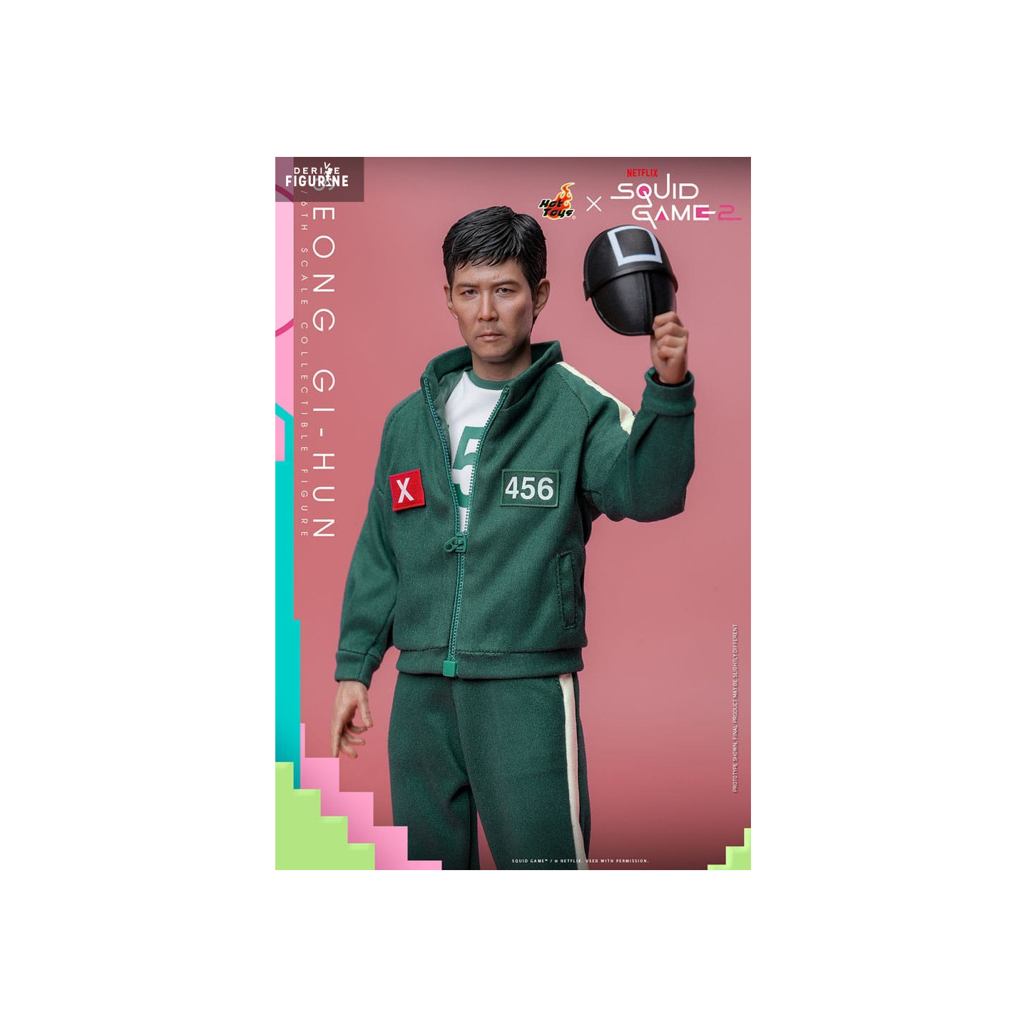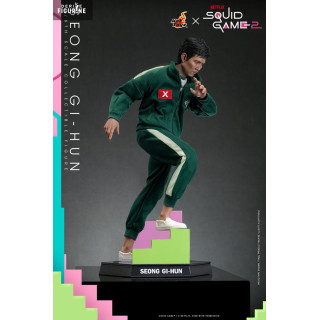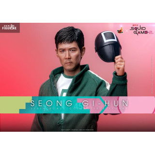 Figurine officielle de Seong Gi-hun mesurant environ 30 centimètres de haut, à l'échelle 1/6. Le fabricant est Hot Toys.