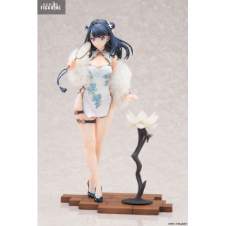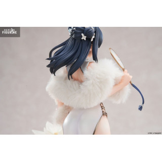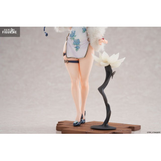 Cette figurine la représente avec un style résolument unique, habillée d'une somptueuse robe chinoise blanche ornée de motifs floraux bleus. Les détails de la tenue, avec les broderies délicates et les accessoires comme son éventail, mettent en valeur sa grâce naturelle et ajoutent une touche de sophistication à son apparence. Elle porte également une étole en fausse fourrure qui accentue son allure distinguée. En complément, la base en bois et la fleur sculptée à ses côtés ajoutent un cadre harmonieux et esthétique à cette pièce de collection.