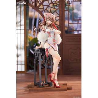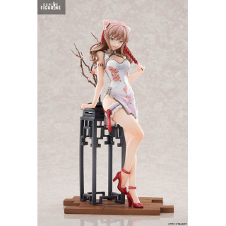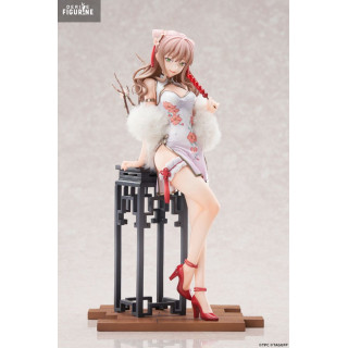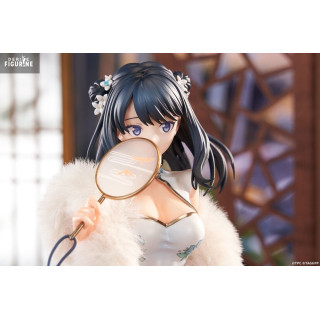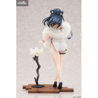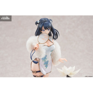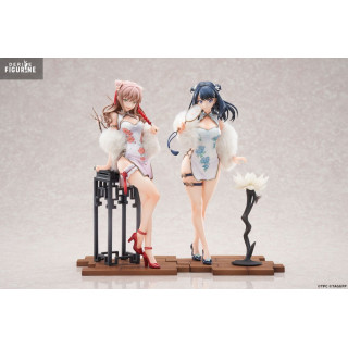 Les figurines représentent Rikka et Yume dans des robes chinoises somptueusement décorées, ornées respectivement de motifs floraux bleus et rouges. Rikka tient un délicat éventail dans sa main, symbolisant son caractère raffiné et réfléchi, tandis que Yume, assise avec un sourire énigmatique, semble incarner une confiance subtile. Les détails minutieux de chaque figurine, tels que les broderies de leurs robes, les étoffes en fausse fourrure, et les accessoires élégants, ajoutent une touche de raffinement. Le décor est complété par des éléments distinctifs comme une fleur de lotus et un meuble en bois noir, sublimant l'ensemble.