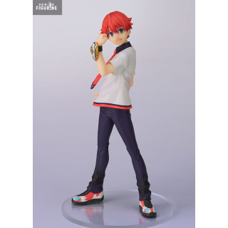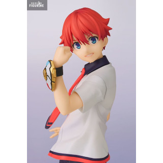 Vêtu de son uniforme scolaire revisité – chemise blanche à col rouge, pantalon foncé ajusté et baskets stylées – Yuta affiche un regard déterminé, le bras levé, prêt à fusionner avec Gridman. Le détail du Primal Accepter à son poignet est fidèlement reproduit, soulignant l’attention portée à chaque élément.