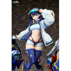 Rikka est représentée debout, saluant légèrement de la main droite, son regard assuré pointé droit devant. Elle porte une tenue sportive revisitée : veste blanche ample avec écussons, brassière, culotte haute et bottes mécaniques d’un bleu métallique brillant. Deux modules volants encadrent la scène, suspendus sur tiges transparentes. L’ensemble repose sur un socle circulaire orné du logo AXGRIT et d’un effet d’énergie bleutée.