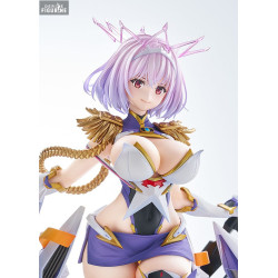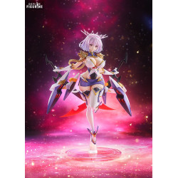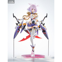 La tenue ultra-moulante mélange blanc, violet et doré avec des touches translucides. Des épaulettes dorées rigides, un collier graphique et des renforts aux jambes renforcent le design hybride entre pilote et arme vivante. Le socle rose semi-transparent, orné de cercles magiques, accentue l’effet « interface virtuelle » autour d’elle.