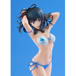 Visuellement, on la voit en bikini bleu clair avec des liens bleus, et un petit motif bleu sur le haut. Ses bras sont relevés derrière la tête, comme si elle attachait ses cheveux, ce qui crée une pose souple avec un léger déhanché. Ses cheveux sont bleu foncé, avec une frange et des mèches ondulées qui encadrent le visage, et son regard est tourné vers l’avant avec un léger sourire. Elle est pieds nus et repose sur une base hexagonale au dessus jaune sable avec un contour bleu clair, pratique pour l’exposer proprement sur une étagère.