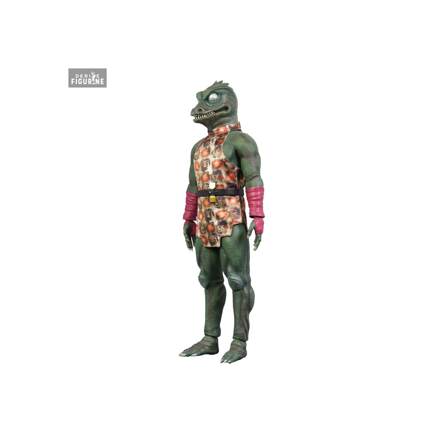 Côté design, la sculpture en PVC met en valeur chaque écaille texturée de sa peau grise et violacée. Il porte une tunique en tissu imprimé rouge et marron, ceinturée à la taille, et un bandage violet autour de l’avant-bras gauche. Le visage, aux yeux globuleux et à la mâchoire garnie de dents acérées, capture son expression menaçante. Le socle transparent assure sa stabilité, tandis que le bras articulé et la nuque mobile permettent de varier les poses.