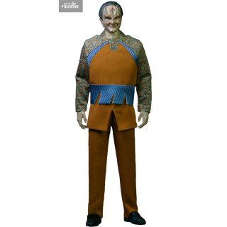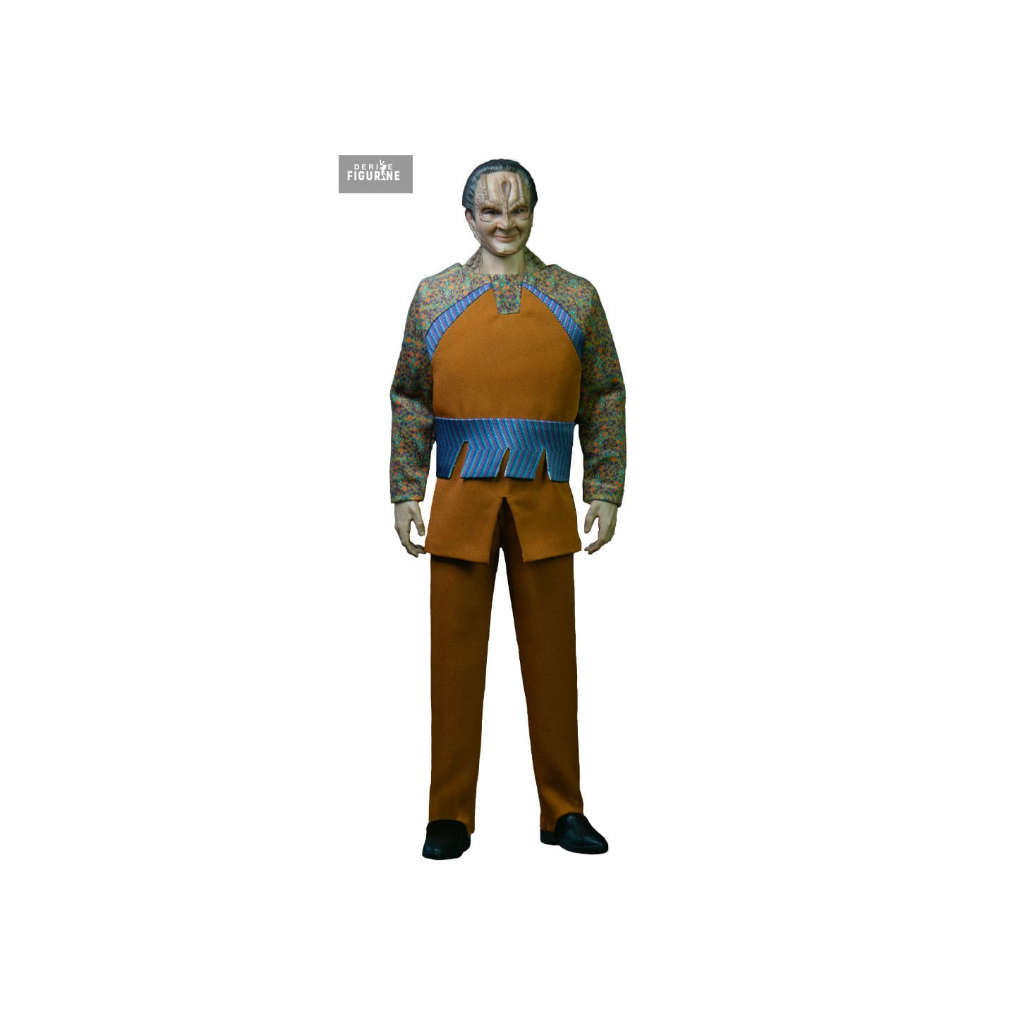 La figurine capture fidèlement son apparence reconnaissable : visage aux stries caractéristiques des Cardassiens, sourire en coin, posture droite. Il porte une tunique orange brûlée structurée, surmontée d’un plastron bleu orné de motifs géométriques, assorti à sa large ceinture. Les manches longues sont recouvertes d’un motif floral complexe. Les chaussures sombres terminent cet ensemble à la fois sobre et typiquement cardassien.