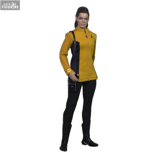 Le design, inspiré directement du personnage tel qu’interprété à l’écran, présente un sculpt tête ultra-réaliste aux traits doux et déterminés, une chevelure blonde subtilement texturée, et un uniforme médical blanc en tissu fin orné de motifs géométriques gris sur les manches. La fermeture éclair centrale, le badge Starfleet doré, les poches fonctionnelles et les bottes blanches complètent une silhouette fidèle, du pli discret des manches aux coutures précises.