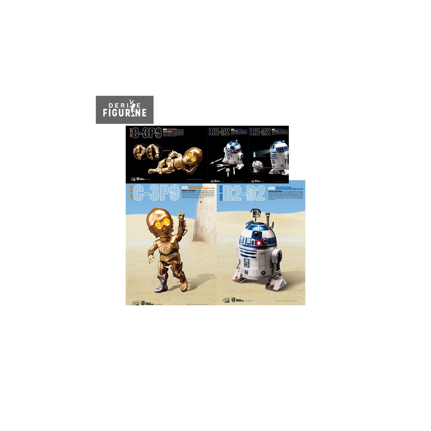 Figurine officielle de C-3PO et R2-D2 en PVC d'environ 15/10 centimètres de haut, issue de la collection Egg Attack Action. Les deux plus célèbres droïdes de Star Wars prennent vie ! Le fabricant est Beast Kingdom.