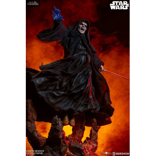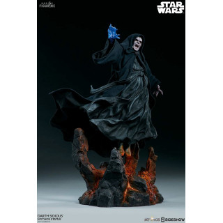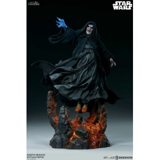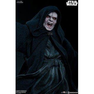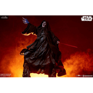 Figurine officielle de Dark Sidious en résine et PVC mesurant environ 53 x 51 x 24 centimètres. Elle est issue de la collection Mythos. Le fabricant est Sideshow Collectibles.