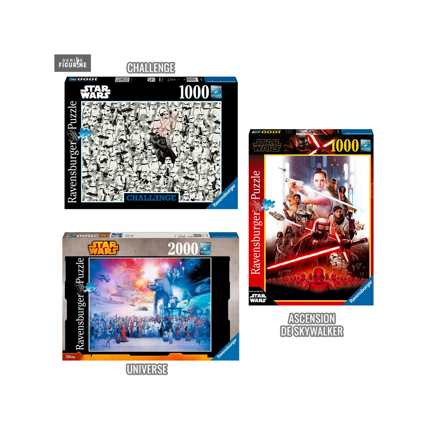 Puzzle Star Wars officiel au choix entre la version Challenge ou Ascension de Skywalker de 1 000 pièces mesurant environ 50 x 70 centimètres ou Universe de 2 000 pièces mesurant environ 98 x 75 centimètres. Le fabricant est Ravensburger.